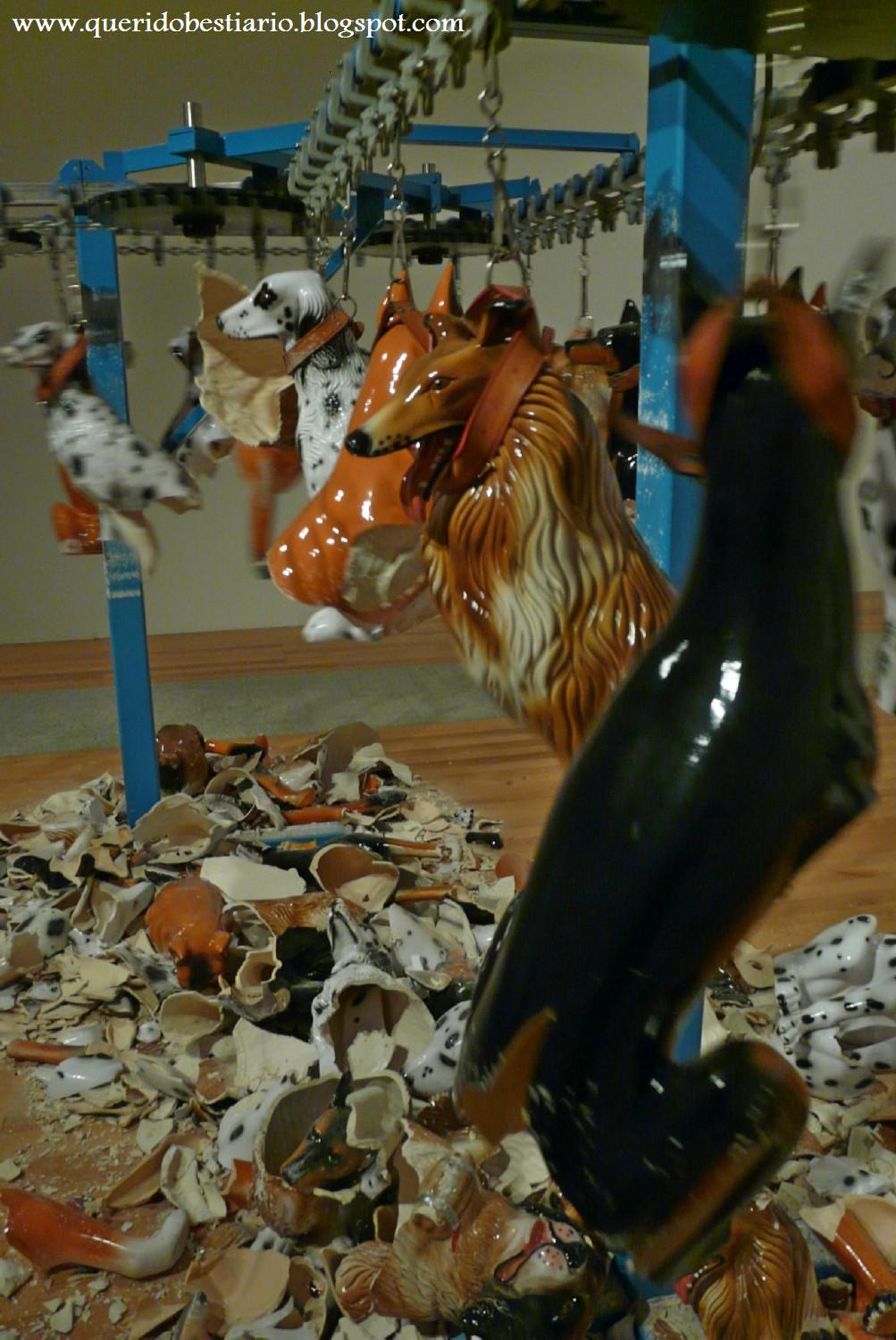 Passerelle (2005), somos convidados - através de um pedal à nossa disposição - a desencadear um mecanismo giratório que suspende cães em faiança presos pelo pescoço por grossas coleiras de couro. Ao aceitar fazê-lo estamos a contribuir para o processo criativo - e ao mesmo tempo destrutivo - que justifica a própria obra. Quando, em Maio último, visitei a exposição "Sem Rede" no Museu Berardo eram já mais os cacos que jaziam no chão do que os animais suspensos na engrenagem. Só havia dois cães inteiros; todos os outros se apresentavam mais ou menos quebrados.