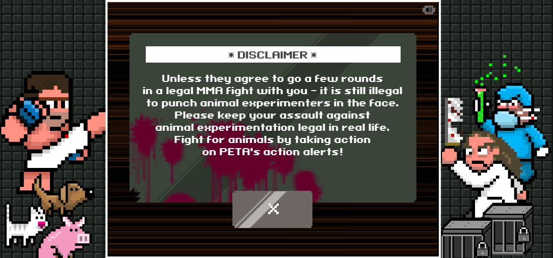 Para evitar constrangimentos legais - ou não fosse nos Estados Unidos - surge no início do jogo o inevitável disclaimer, onde é ressalvado que agredir cientistas na vida real ainda é ilegal [ênfase meu]. O tom de desilusão da PETA não passa aqui despercebido.